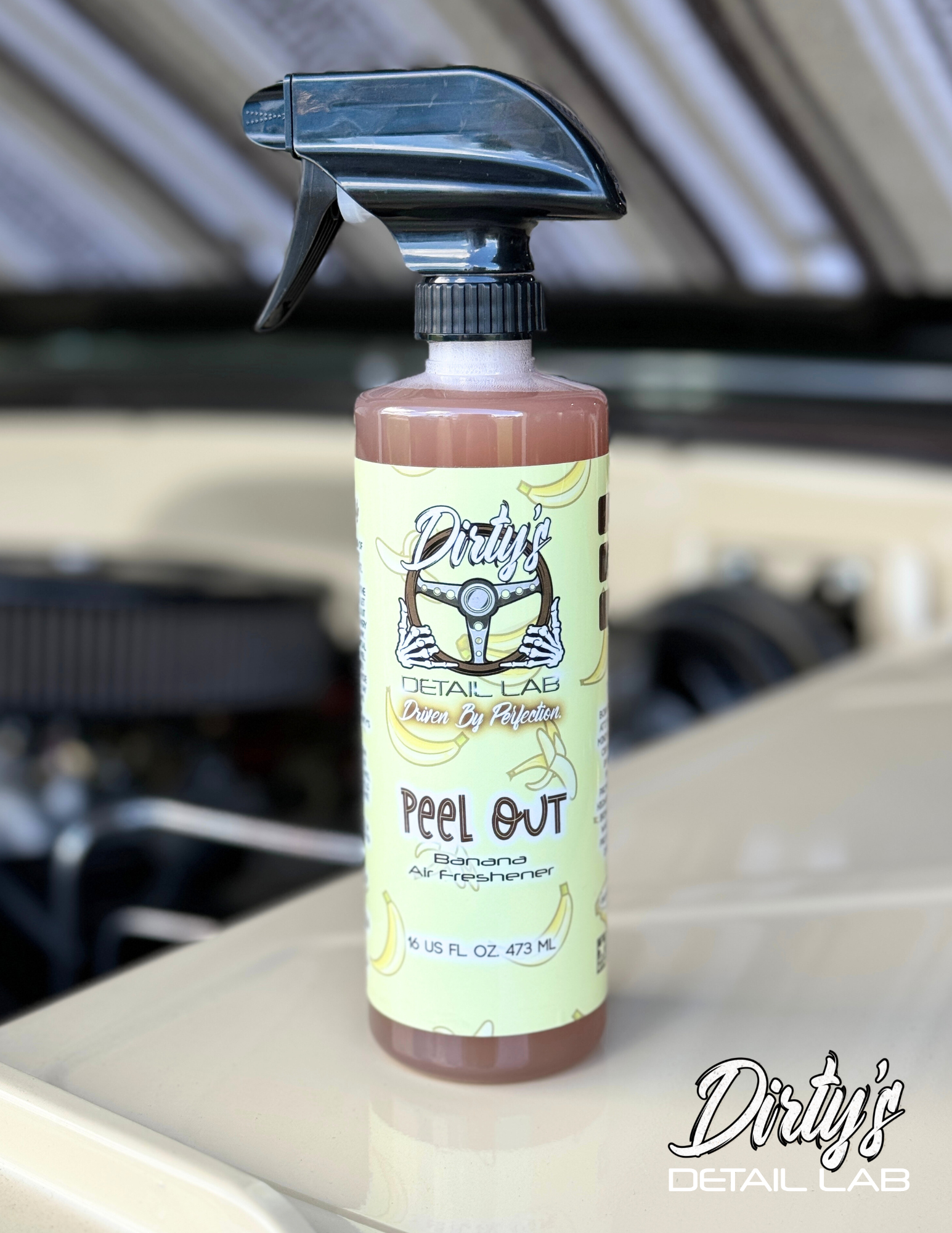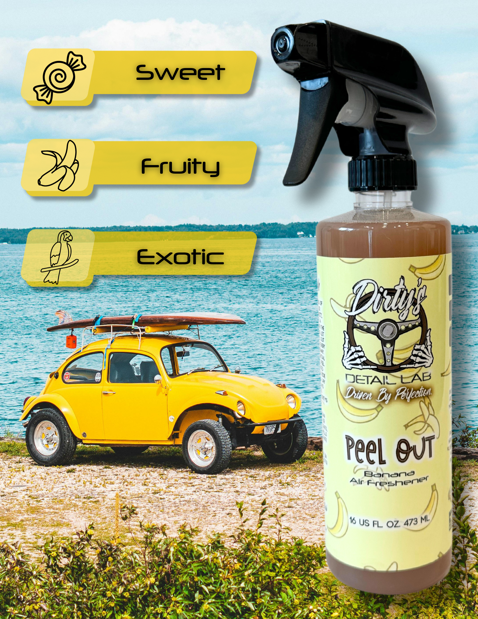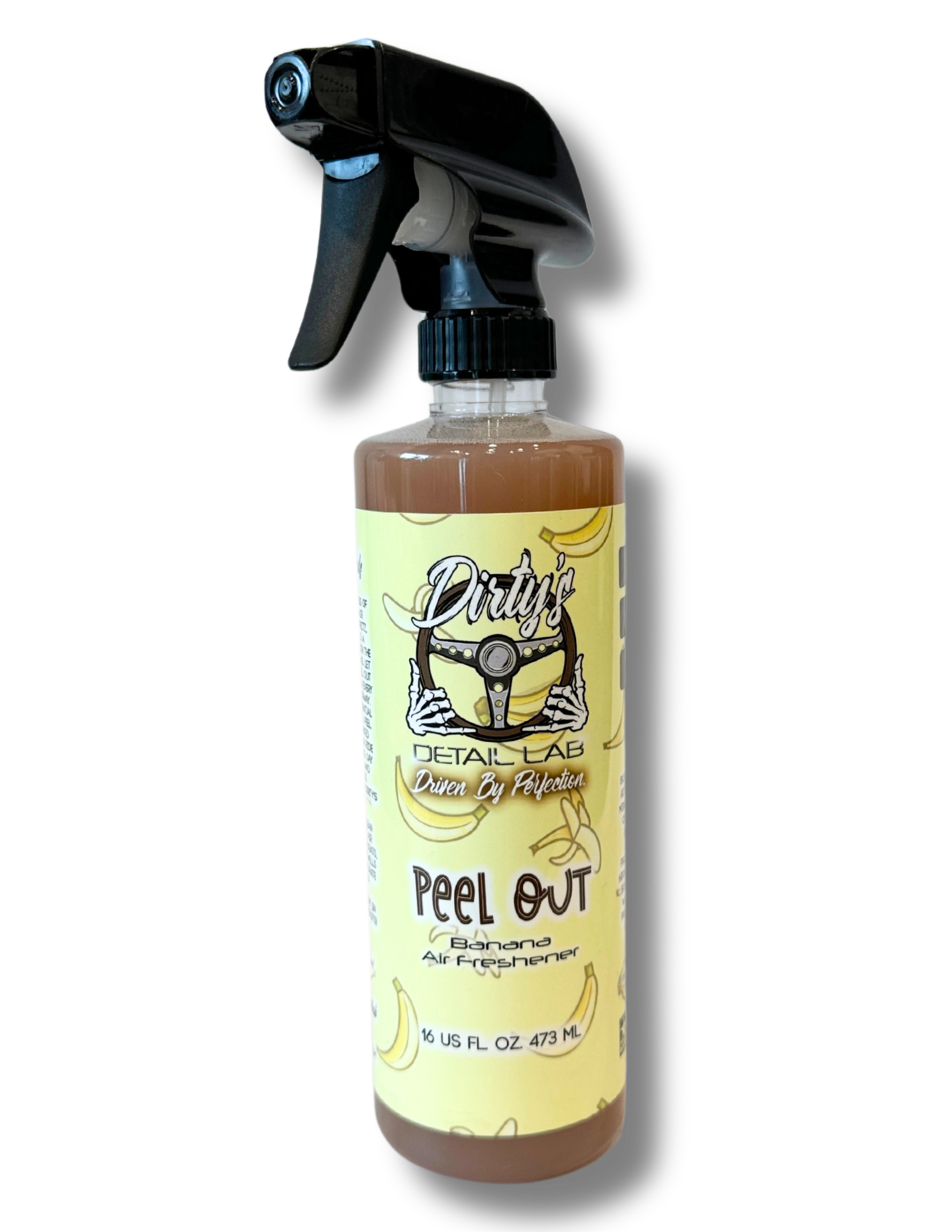 Bask in the sweet Creaminess of Dirty's Peel Out banana air freshener. With just one spritz, you'll be whisked away to a tropical paradise filled with the sweet aroma of ripe bananas. Let the tantalizing scent of Peel Out infuse your vehicle, turning every drive into a delightful getaway. Crafted with the finest essential oils and odor eliminators, Peel Out not only masks unwanted odors but also leaves your ride smelling fresh and inviting. say goodbye to stale scents and hello to the irresistible fragrance of bananas with Dirty's Detail Lab Peel Out!