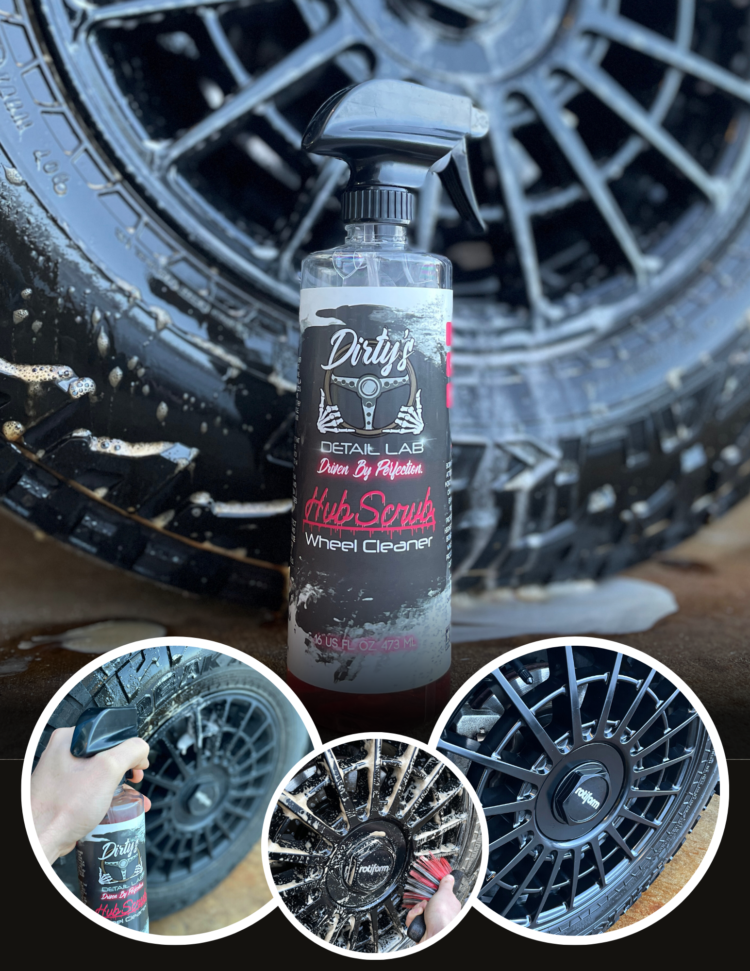 Dirty’s Pro Tip: After use, protect the wheels from future dirt and grime with Cera-Mist or Quickie detail spray. Thicc Kicks or Midnight tire shine will complement your clean wheels.
